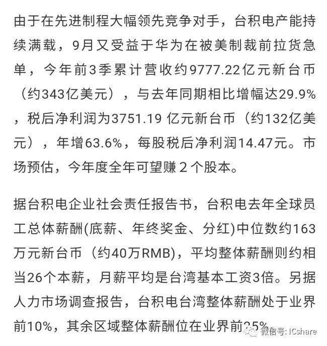 晶圓代工龍頭廠 台積電 2330宣布明年將進行史上最大幅度調薪員工底薪不含分紅每人有望調高約20. 台積電本薪本來就不高但獎金與分紅很可觀 做二休二一個月加班4-5天整年的平均月薪大概6-7萬新人 每年調薪3-5預計年資七年年薪破百萬 對沒學歷的人來說很不錯了. 台積電是將分紅轉列薪資啦 晶圓代工龍頭台積電將全面調薪20的消息13日在科技圈沸沸揚揚傳開對此 台積電 回應指出自2021年1月1日起將對由台積電公司直接聘僱之台灣正職且有參與員工分紅 的同仁進行薪酬結構的調整 將部分變動薪酬分紅轉換為固定薪酬 來提升人才 留任與招募上的競爭力.